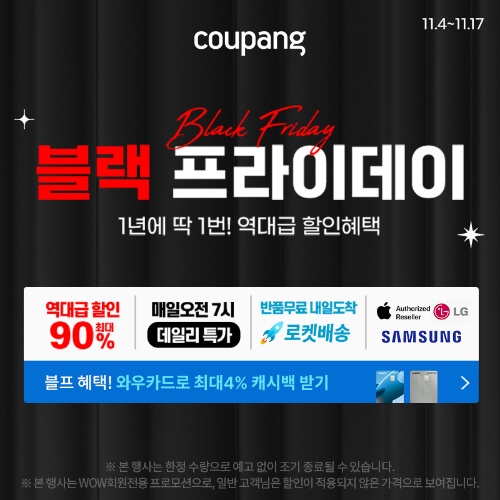- 와우회원 특전: 쿠팡 와우회원에게는 무료배송, 익일 도착, 무료 반품 등 다양한 혜택이 제공됩니다. 블랙프라이데이 기간 동안 회원 가입해 추가 혜택을 받아보세요.