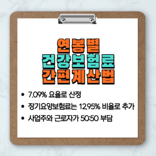 - 월급여 × 7.09% ÷ 2 = 근로자가 부담하는 건강보험료